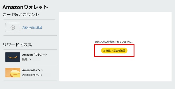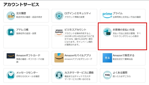 Amazonにログインして「アカウントサービス」→「お客様の支払い方法」→「お支払い方法を追加」と進みます。