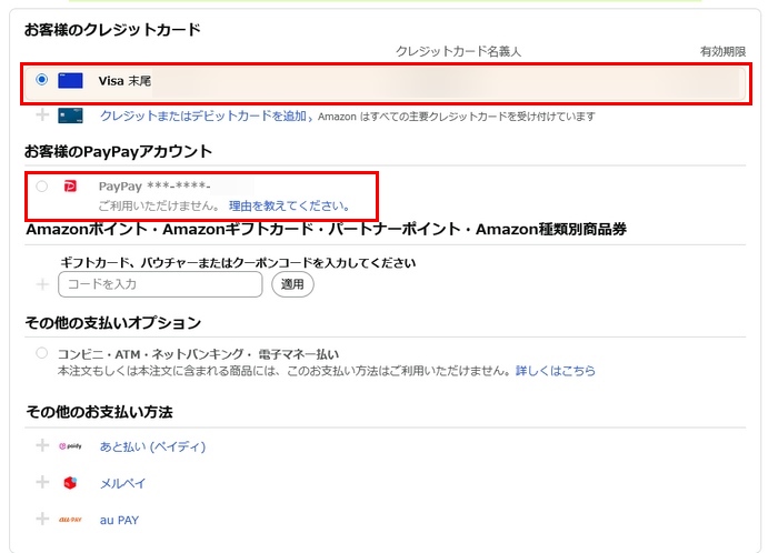 こんな感じでクレジットカードの欄にPayPay残高カードの情報を入力します。カード名義欄には自分の名前を入力します。ちなみにすぐ下の欄にはPayPayは利用できないと表示されていました。