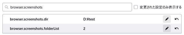 検索バーに browser.screenshots と入力。browser.screenshots.folderList の数値を 2 に変更します。(ペンのマークで編集、チェックマークで決定)